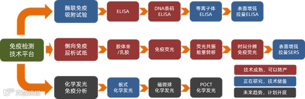 随着医疗保障投入和消费水平提高,我国IVD行业已经进入成长期,保持着较高增长速度,在试剂、仪器及系统等方面均取得了不少进展,因此,免疫诊断试剂的主流地位仍将保持较长时间。为了避免细胞融合、杂交瘤反复克隆化的过程,本项目开发出了一种新型的抗体筛选技术,这种技术能够高效的获得抗原特异性抗体基因,再通过基因表达系统生产抗体。整个过程仅需1-2周,其筛选效率比传统筛选过程提高了10倍,这为诊断试剂的开发奠定了一个良好的基础。本团队作为全省乃至全国最早开始进行免疫快速检测技术应用研究及推广的团队,十几年以来一直对POCT快速检测技术的工艺和应用进行研究,并开发了多种新型信号的POCT快检方法(如图所示),包括胶体金免疫层析试纸、荧光免疫层析试纸、荧光淬灭免疫层析试纸、乳胶免疫层析试纸、时间分辨免疫荧光层析试纸、表面增强拉曼层析试纸等,其中胶体金、荧光微球、荧光淬灭、乳胶微球、时间分辨免疫荧光层析试纸工艺成熟,性能稳定,已与相关企业合作验证并转产,大部分已经上市销售,相关产品在市场上广受好评,为推动我国POCT快检产业的发展贡献了一点力量,也为企业带来了不菲的收益。