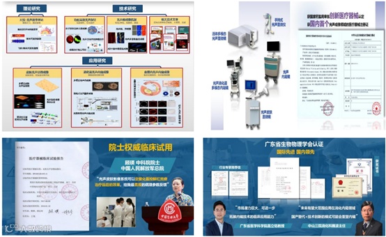 新型光声学联合影像精准诊断技术与设备项目致力于光声学技术研究及其在生命科学与临床医学的应用和转化工作,在原创性技术和自主知识产权的基础上,项目开展了从分子水平、细胞水平、到组织水平的跨层次、多尺度的无损、快速光声影像方法与技术研究,将前沿激光、超声技术的特点及优势融合到生命科学的疑难问题研究中,填补了传统影像技术在灵敏度、分辨率和成像深度之间的检测盲区,突破了现有医学影像技术在高分辨率病理指标成像与诊治方面的不足,实现了光声学临床试验与仪器转化。
