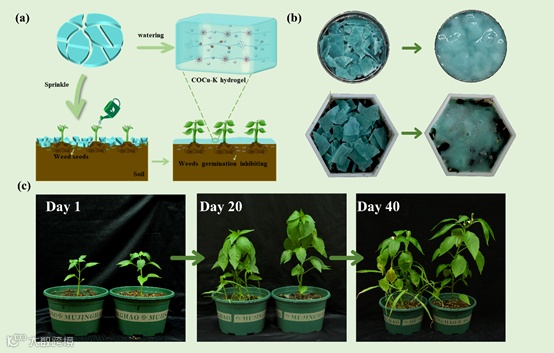 在农业生产过程中,杂草防治一直都是困难重重。农户们多选用化学除草剂和物理覆盖两种方法进行防治,但化学除草剂毒性高,通过抑制光合作用达到杂草防治的物理覆盖地膜多为塑料地膜,不可降解,需人工铺设和移除,只适用于平整、规则的农田,对环境和人体健康有着较大的潜在危害性。因此,本研究提出了一种“可播种式”凝胶地膜,“哪里需要撒哪里”、“省时省力”,将凝胶薄膜碎片简单撒在土壤表面,浇水即可形成完整的物理屏障达到杂草防治功效。该地膜具备的自修复性可保障地膜在应用过程中不因脱水而开裂、丧失杂草防治能力,同时具备一定保水抗冻能力,丰富的C、N、K源及良好的保水能力促进作物生长,提高作物产量与品质,在可持续发展农业中具有广阔的应用前景。