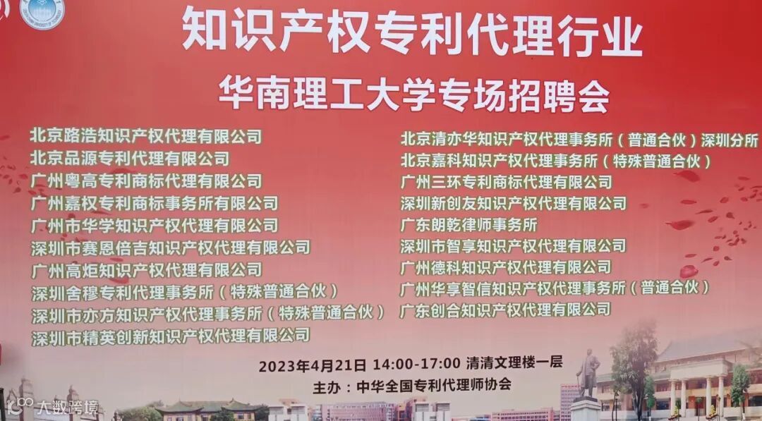 4.21日下午,知识产权专利代理行业华南理工大学专场招聘会在五山校区清清文理楼一层举行。公司管委会主任李卫东来到现场与中华全国专利代理师协会副秘书长曾凡夫就此次招聘会进行深入交流。本次招聘会共19家代理机构参会,公司专利事业部总经理助理蔡克永、行政部行政助理刘诗乐设置招聘展位,与前来咨询的同学积极互动交流,使其更好地了解公司岗位情况及知识产权相关职业。此次知识产权专利代理行业专场招聘会为有志于深入了解专利工作、保护知识产权、提升自身法律职业素养的毕业生提供了一个与专利代理机构面对面对接的有效交流平台,推动了知识产权行业的人才发展建设。