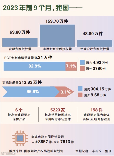拥有发明专利授权量69.88万件,实用新型专利授权量159.70万件,外观设计专利授权量48.80万件,PCT专利申请受理量5.31万件(其中国内4.93万件,国外3790件),商标注册量313.83万件(其中国内304.15万件,国外9.68万件),6个产品被批准为地理标志保护产品。5223家主体核准使用地理标志专用标志市场主体,158件地理标志作为集体商标、证明商标被注册。另外集成电路布图设计登记方面,申请有8857件,发证7913件。