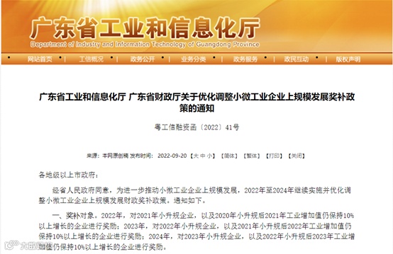 《广东省工业和信息化厅 广东省财政厅关于优化调整小微工业企业上规模发展奖补政策的通知》粤工信融资函〔2022〕41号
