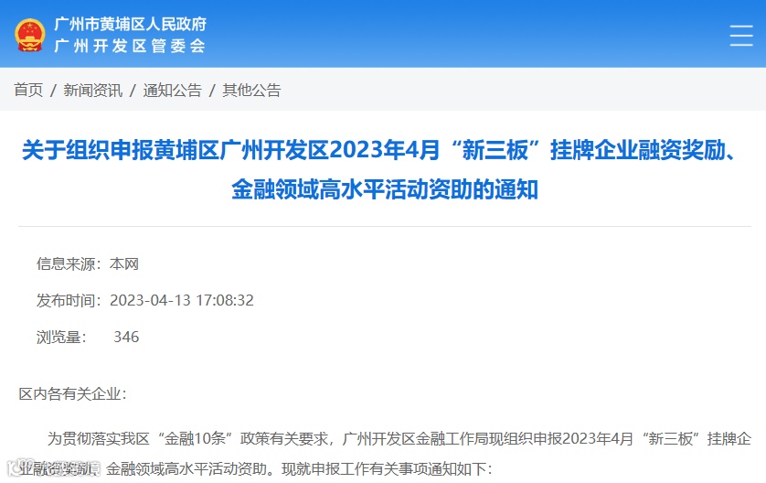为贯彻落实我区“金融10条”政策有关要求,广州开发区金融工作局现组织申报2023年4月“新三板”挂牌企业融资奖励、金融领域高水平活动资助。现就申报工作有关事项通知如下:
