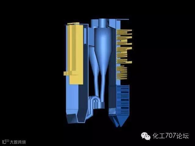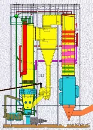 在离心力作用,烟气中的固体颗粒被抛向分离器筒壁,并沿壁面下滑进入连接分离器的立管中。通过回料阀进入炉膛。烟气进去烟道。
