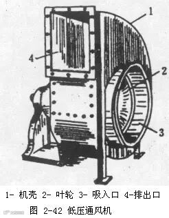 (1)离心通风机的结构和工作原理 离心通风机的结构和工作原理与离心泵大致相同。低压通风机的叶片数目多、与轴心成辐射状平直安装。中、高压通风机的叶片则是后弯的,所以高压通风机的外形与结构与单级离心泵更相似。