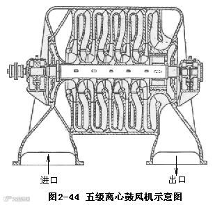 离心鼓风机与压缩机又称透平鼓风机和压缩机,其结构类似于多级离心泵,每级叶轮之间都有导轮,工作原理和离心通风机相同。离心压缩机的段与段之间设置冷却器,以免气体温度过高。离心鼓风机与离心压缩机的规格、性能及用途详见有关产品目录或手册。