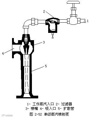 喷射泵的工作流体可以是蒸汽,也可以是液体。图2-49所示的是单级蒸汽喷射泵。工作蒸汽以很高的速度从喷嘴3喷出,在喷射过程中,蒸汽的静压能转变为动能,产生低压,而将气体吸入。吸入的气体与蒸汽混合后进入扩散管4,使部分动能转变为静压能,而后从压出口5排出。