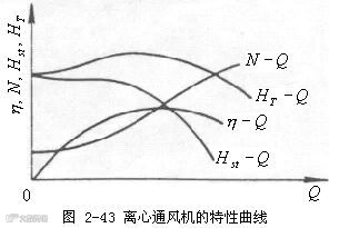 通风机出厂前在温度为20℃的常压下(101.3kPa)实验测定其特性曲线。离心通风机的特性曲线与离心泵的特性曲线相比,此处增加了一条静风压随流量的变化曲线。