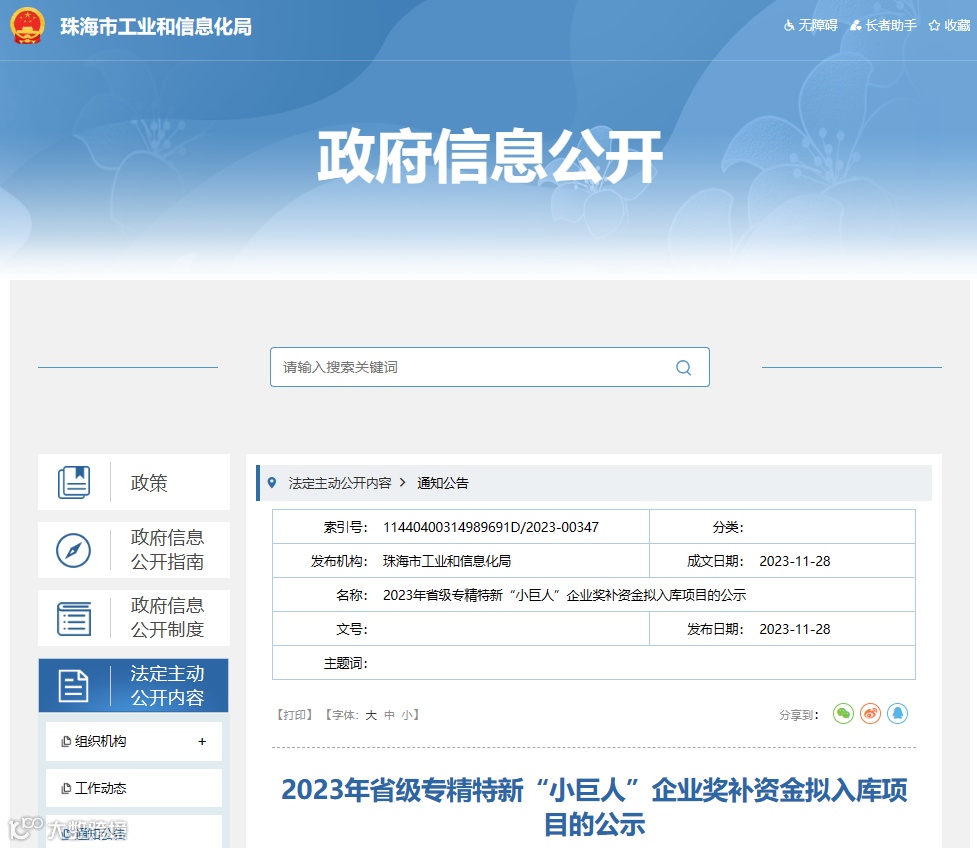 根据《广东省工业和信息化厅关于开展2023年专精特新“小巨人”企业奖补资金申报的通知》(粤工信融资函〔2023〕31号)要求,我局开展了2023年省级专精特新“小巨人”企业奖补资金申报工作,经企业申报、部门审核、市工信局党组会审议等程序,现对拟入库的41个项目进行公示,名单详见附件。