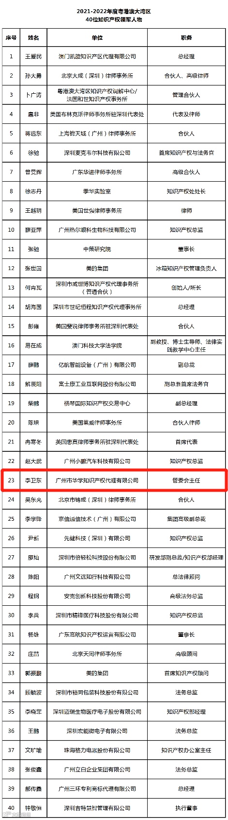6月26日,IPRdaily中文网公布了2021-2022年度粤港澳大湾区40位知识产权领军人物名单,公司管理委员会主任李卫东成功入选。