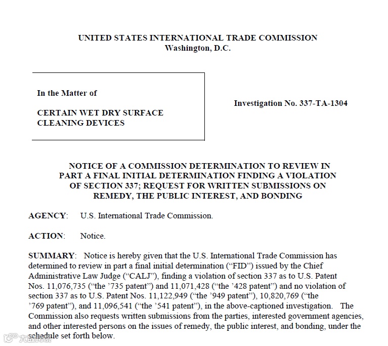2022年3月,USITC决定对特定干湿表面清洁设备(Certain Wet Dry Surface Cleaning Devices)启动337调查(案号为337-TA-1304)。