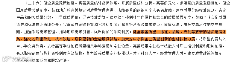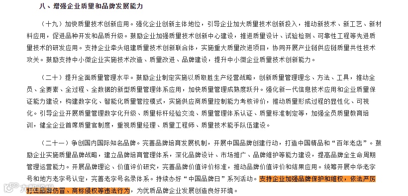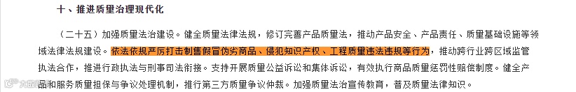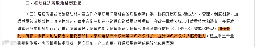 《纲要》还从推动经济质量效益型发展、增强产业质量竞争力、加快产品质量提档升级、提升建设工程品质、增加优质服务供给等方面提出了要求。其中,涉及知识产权的内容如下(节选):