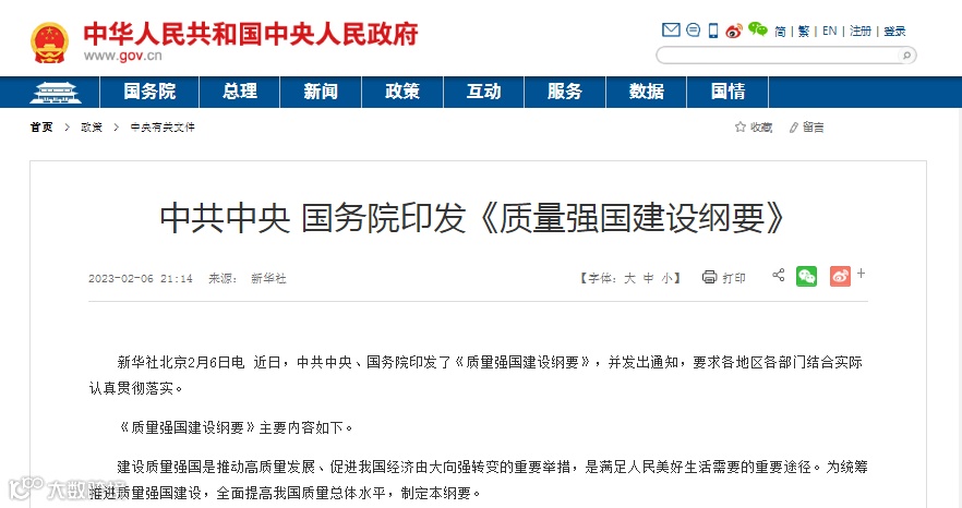 建设质量强国是推动高质量发展、促进我国经济由大向强转变的重要举措,是满足人民美好生活需要的重要途径。为统筹推进质量强国建设,全面提高我国质量总体水平,2023年2月6日,中共中央、国务院印发《质量强国建设纲要》。