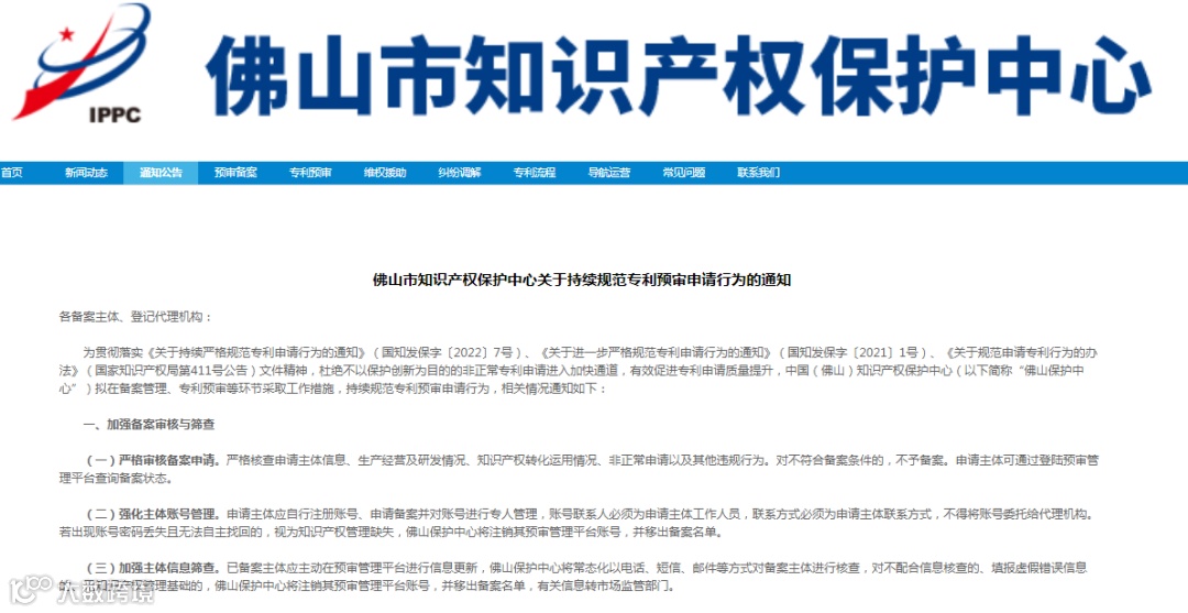 为贯彻落实《关于持续严格规范专利申请行为的通知》(国知发保字〔2022〕7号)、《关于进一步严格规范专利申请行为的通知》(国知发保字〔2021〕1号)、《关于规范申请专利行为的办法》(国家知识产权局第411号公告)文件精神,杜绝不以保护创新为目的的非正常专利申请进入加快通道,有效促进专利申请质量提升,中国(佛山)知识产权保护中心(以下简称“佛山保护中心”)拟在备案管理、专利预审等环节采取工作措施,持续规范专利预审申请行为,相关情况通知如下: