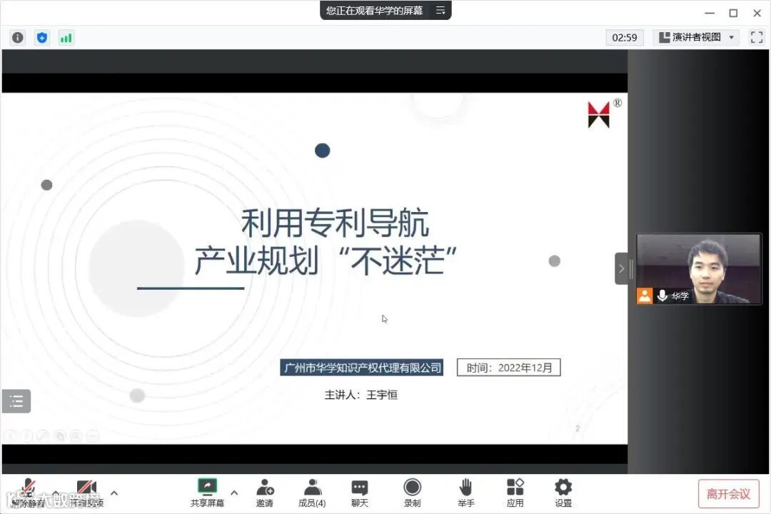 2022年12月1日15:00-16:30开展了“知产赋能——专利导航指引企业走好‘创新路’”人才培养活动(第一场),此场课程培训,王宇恒老师先从专利导航的定义、分类、作用以及其应用场景四个方面向学员们科普了专利导航的基础知识,特别指出目前专利导航行业痛点——传统专利导航无法满足产业创新发展决策需要。紧接着,王老师就《专利导航指南》标准进行详细解读并分享了产业规划案例,最后,王老师着重介绍了专利导航的作用,不仅指出专利导航的本质,还强调了专利导航对洞察专利背后的企业、人才、资本与产业的重要作用。