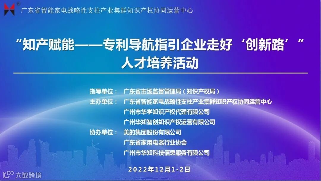 2022年12月1-2日,广东省智能家电战略性支柱产业集群知识产权协同运营中心通过网上直播的方式成功举办专利导航人才培养活动,此次活动的主题是“知产赋能——专利导航指引企业走好‘创新路’”,历经两天,共140人次参加了此次网上直播培训。