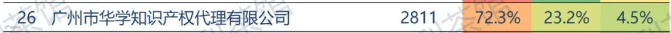 数据显示,2023上半年发明专利结案量大于100件的代理所总计1,312家,其中广州市华学知识产权代理有限公司以发明结案量2,811件跻身全国百强榜单第26名、广东前列,并以发明专利授权率72.3%位居发明结案量全国百强榜单的第23名、广东第1名。