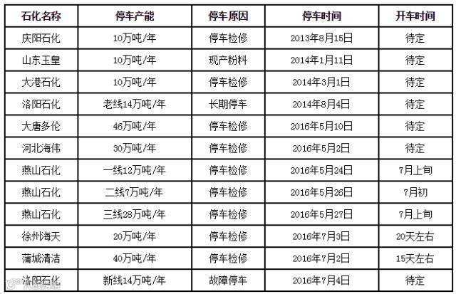 国内PP装置停车或转产情况统计