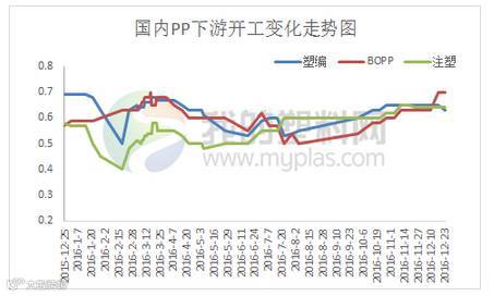 国内聚丙烯下游行业开工率变化不大。其中塑编行业开工率在63%左右,共聚行业开工率在64%,BOPP行业开工率在70%左右。