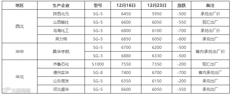 截至本周末,华北地区山东信发SG-5厂提6130元/吨,较上周五跌580元/吨;杭州中泰SG-5库提6430元/吨,较上周五跌420元/吨;广州大沽1000库提7480元/吨,较上周五跌220元/吨。