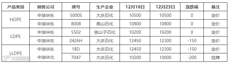 表1 本周国内PE出厂价格调整(单位:元/吨)