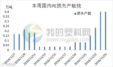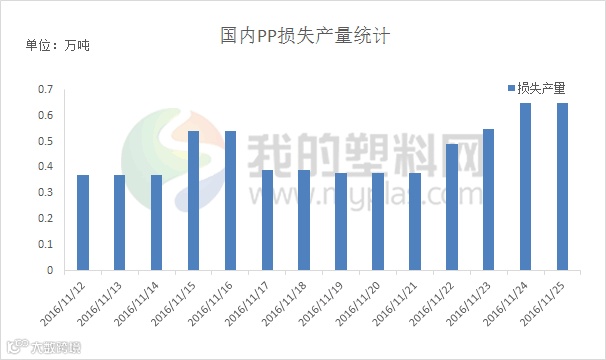 我的塑料网11月25日报道:本周国内PP市场装置多稳定运行为主,周内呼和浩特石化开车,神华榆林、辽通化工新装置、福建联合新一线、中韩石化JPP线停车,市场局部地区货源供应略有缩减。我的塑料网统计,本周国内PP市场损失产能约在3.48万吨,较上周(2.93万吨)增加0.55万吨。下周中韩石化JPP线、神华榆林、宁波富基石化开车,我的塑料网预计下周国内PP市场货源供应量将微幅增加。