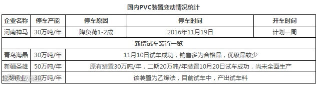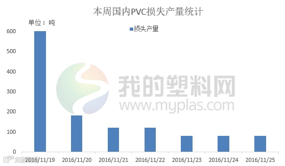 我的塑料网11月25日报道:本周国内PVC市场装置开工率有所提升,周内山东东岳、河南联创PVC装置恢复至正常水平;新增河南神马PVC装置降负荷减产。我的塑料网统计,本周国内PVC市场损失产能约在1279吨。青岛海晶30万吨乙烯法PVC装置前期销售多为合格品,随着装置正常运行,有望增加优级品供应量。另外有盐湖镁业及新疆圣雄新增装置试车,后期PVC供应量将小幅增加。