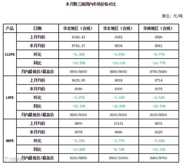 5月国内PE市场跌势难止:五一假期归来,线性期货连日下跌,且石化频繁下调出厂价,商家心态悲观,随行让利。虽月中期货大涨,给予市场上涨一定支撑,但下游需求延续疲软,导致商家出货缓慢,部分继续让利。月底多数商家基本完成销售计划,且交易热情不高,随行报盘居多。本月LLDPE月均价9011元/吨,环比跌4.9%,同比跌13.3%。LDPE月均价9290元/吨,环比跌4%,同比跌18.4%。HDPE各品种普遍下跌,环比分别跌150-800元/吨。