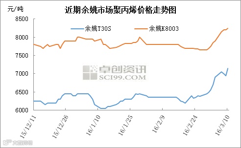 本周国内聚丙烯市场行情延续涨势,与我们上周预测基本一致,市场价格再次涨300元/吨左右,多数地区拉丝价格超过7000元/吨。以余姚市场绍兴三圆T30S为例,周均价环比上涨6.34%。油价反弹以及期货市场的强势仍是支撑现货市场走高的主要推动力,石化企业借机频繁涨价,加大对货源成本支撑力度,市场报价节节攀高。下游工厂延续按需采购为主,适度备货,终端成交跟进有限。