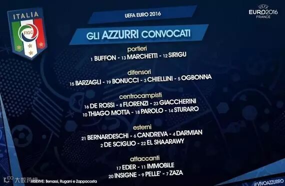 )、10-莫塔(巴黎圣日耳曼)、14-斯图拉罗(尤文图斯)、16-德罗西(罗马)、18-帕罗洛(拉齐奥)、23-贾凯里尼(博洛尼亚);