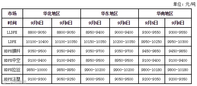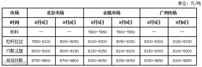 石化个别大区出厂价下调,对市场的成本支撑有所减弱。期货主力合约大幅上涨,对市场心态产生一定的提振。G20峰会结束,华东交通管制放松,下游工厂少量接货,部分前期因政策影响停车的工厂将陆续恢复生产,近期市场将出现一轮补货行情,市场行情存在小幅震荡上涨的可能。以华东市场为例,余姚市场拉丝主流价格在8050-8300元/吨。建议业者加强对石化销售政策、下游开工情况及PP期货的关注力度。