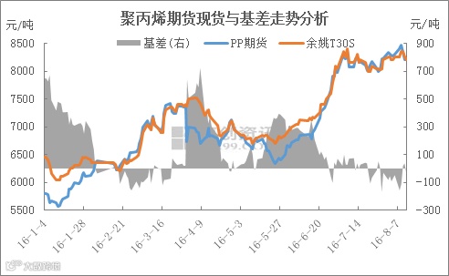 在市场缺乏强劲消息面指引的情况下,PP期货与现货依然是息息相关的,并且期货很大程度上影响现货市场走势。近期PP市场行情震荡走弱主要受期货市场技术性回调的拖累,加之终端需求对高价货源排斥,货源消化进度偏慢进一步加剧弱势走势。期货对现货升水,套保盘继续锁定部分货源,供应趋紧的现状对价格走弱形成支撑。8-9月份PP装置停车检修相对集中,在暂时没有新投产装置的情况下,市场供应趋紧或进一步加剧。