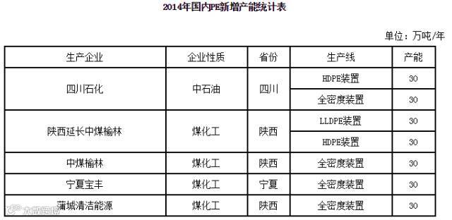 据统计,2014年国内新增产能在210万吨/年,除四川石化为油制PE外,其他四家均为煤制PE生产企业。一方面是因为2010年神华