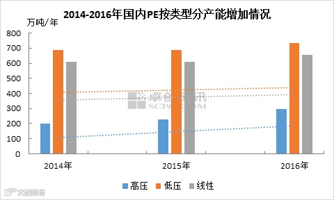 上图为国内聚乙烯2014-2016年线性、低压、高压的产能增长情况。其中2016年产能为预计至2016年年底乐观来看的总产能。从趋势线上可以明显看出,近三年来,高压增长