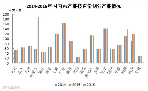 我国PE产能分布在以上19个省份中,2014年和2015年均为广东省产能占比最大,主要是因为国内几个大的石化,像