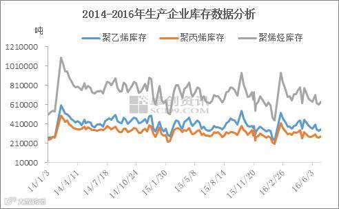 从近三年来的生产企业库存数据来看,库存重心缓慢下移趋势明显。尤其今年以来,除春节期间库存积累外,整体呈现震荡减少趋势。2016年1-6月份,生产企业库存平均水平同比2015年下跌3.8%,同比2014年1-6月份跌幅在12.9%。在当前国内聚丙烯市场影响因素多元化的背景下,生产企业将库存保持低位水平对增强自身在市场上的话语权具有非常大的作用,尤其是在过去一个月的时间里生产企业受期货强势带动不断趁机拉涨令自身利益明显扩大。