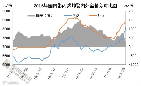 随着内外盘价差逐渐扩大,下游核销工厂转向采购国产料保税一日游货物,该现象主要集中在华东地区。6月,国内生产企业库存持续在低位,加上期货资金力量推动,现货行情打破低迷态势。国产拉丝价格快速上涨,内外盘价差缩小,临近6月底,价差缩窄至300元/吨以内。卓创认为,国产料价格在期货升水下被动跟涨且幅度较大,由资金左右的期货影响现货,上涨基础或不牢固,市场面临调整压力。预计三季度聚丙烯内外盘价差有再次拉大可能。