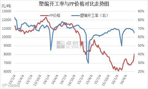 2013年至2015年4月份,塑编企业开工率与PP价格呈现了较为明显的正相关性,两者的趋势拟合度相对较高,自2015年5月开启的长达大半年的下跌行情令塑编企业受益较为明显,因为原料成本的降低带动塑编企业开工率呈现出了缓慢爬升趋势。今年两者的负相关体现的最明显的是5月底至今的趋势表现,原料价格上冲过快并在一个月多一点的时间里反弹1500元/吨,原料成本非预期性的快速爬升令终端成品销售价格难以跟进,塑编企业利润收到非常严重的挤压甚至一度导致部分加工企业面临亏损。而下游企业毛利恶化带来的拿货能力和积极性的下降也将严重考验当下的原料价格趋势表现。