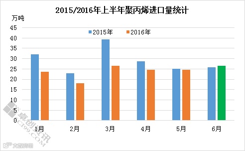 今年前五个月进口量除5月与去年同期基本持平外,其他月份均不及去年同期水平。原因如下:一是国内产能不断释放,冲击进口通用料供应。二是国外市场需求及价格好于中国市场,外商转变销售策略。三是下游工厂根据内外盘价差选择性采购,进口料价格过高时,成本优势削弱。四是部分外盘石化装置检修也造成一定的供应损失。归根结底,供需基本面变化决定了进口量的多少。据卓创跟踪,6月聚丙烯进口量环比、同比或有增加,但幅度有限。
