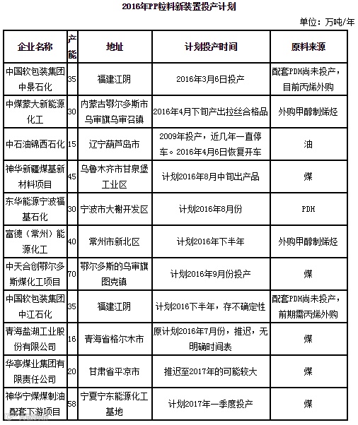 上半年PP新装置投产存在延迟现象。据卓创资讯最新统计,2016年PP计划新增产能调整为300万吨,部分装置投产时间已确定推迟至2017年,目前计划中的装置预计仍有部分无法如期投产。其中上半年已投产的仅有中景石化、中煤蒙大,因此上半年PP市场受新增产能的冲击不大。从下半年看,神华新疆、中天合创等装置按期投产的可能较大。常州富德、宁波福基石化等计划8月份左右投产,但G20峰会在9月初将在杭州举办,受此影响,8月份试车存在较大的困难,预计新装置投产或集中在9月份之后。