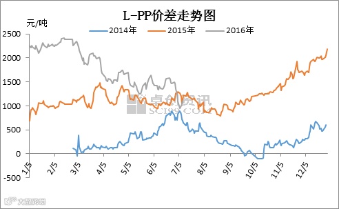 由上图可以明显的看出,L-PP价差存在一定的规律性,上半年,L-PP价差涨跌存在较大的不确定性,但均呈现单边走势,三季度开始价差呈现回落走势,进入9-10月,价差触底反弹,呈现单边上涨走势。由于L-PP价差往年多在四季度呈现单边走势,同时,由于PP走势波动较L期货更为频繁,所以L-PP价差的负相关性更加明显。
