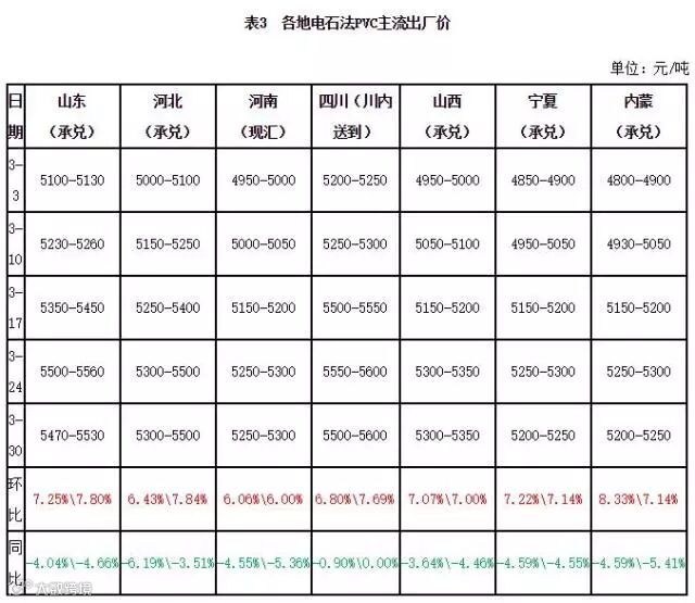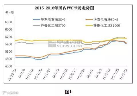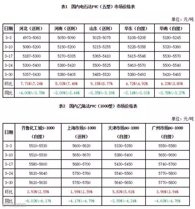 3月份国内PVC市场呈现上扬趋势,截至月底电石法SG-5均价5437元/吨,环比涨288元/吨,涨幅5.59%,乙烯法PVC均价5728元/吨,环比涨205元/吨,涨幅3.71%。价格上涨主要是由于原油走高、