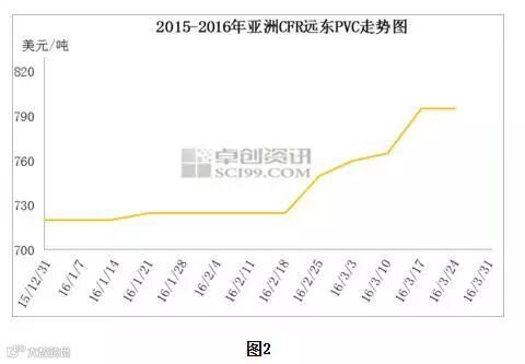 3月份亚洲PVC价格连续上涨,截至月底CFR远东至800美元/吨,环比涨50美元/吨,涨幅6.7%。价格上涨主要是由于乙烯上涨、印度需求恢复以及主要供应商检修所致。