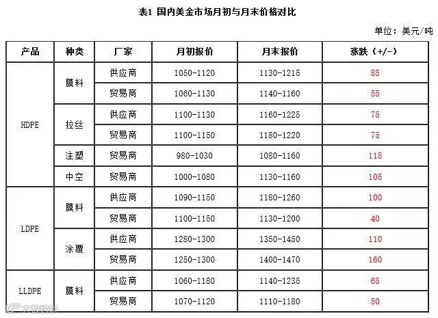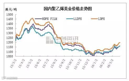 3月聚乙烯美金市场价格环比大幅上涨,超出上月预期,而同比方面,今年3月各品种有8%-10%的跌幅。国内期货市场、石化企业联合大幅拉涨,带动气氛好转,再加上外盘供应减少,价格出现可观的涨势。分品种来看,低压市场膜料供应充足,涨势较慢,价格一度僵持在1130-1150美元/吨,同时也有伊朗、