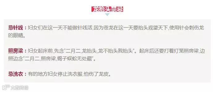 大凡是华人,都知道“二月二,龙抬头”的习俗。农历二月初二前后是廿四节气之一的惊蛰。经过冬眠的龙,到了这一天,就被隆隆的春雷惊醒,人们认为这天正是苍龙“登天”之日。所以对老百姓而言,二月初二日,是非常重要的节日。而在民间传统中龙抬头也有一些禁忌!以下这些禁忌,你一定要知道!
