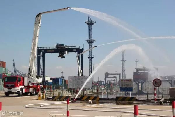 9月11日上午9点,宁波消防支队在宁波大榭招商国际码头开展了危化品事故跨区域作战演练。图为危化品事故消防演习现场。 东方IC 图