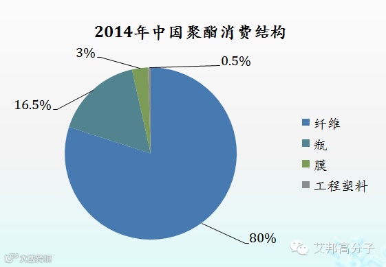 PET聚酯的主要下游应用领域为涤纶纤维、瓶、膜以及工程塑料。其中涤纶纤维(80%)的是最大的应用领域,瓶(16.5%)和膜(3.0%)次之,工程塑料(0.5%)占比较小。