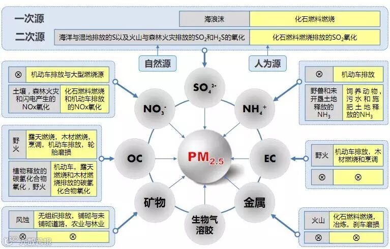 雾霾是指各种源排放的污染物(气体和颗粒物如CO、SO2、NOx、NH3、VOCs、PM),在特定的大气流场条件下,经过一系列物理化学过程,形成的细粒子,并与水汽相互作用导致的大气消光现象。大气污染中涉及到的颗粒物,一般指粒径介于0.01~100μm的粒子,PM2.5是指空气动力学直径小于或者等于2.5微米的大气颗粒物(气溶胶)的总称,学名为大气细粒子。PM2.5组成极其复杂,几乎包含元素周期表所有元素,涉及30000种以上有机和无机化合物(包括硫酸盐、硝酸盐、氨盐、有机物、碳黑、重金属等),真是“小粒子、大世界”。PM2.5直接排放少,以排放源一次排放的气体通过物理和光化学过程生成的二次粒子为主。