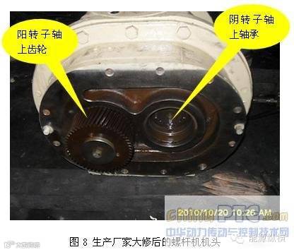 图8是螺杆机头返厂大修后等待安装的照片,图中清楚地看到阳转子上的齿轮和阴转子轴上的滚动轴承。