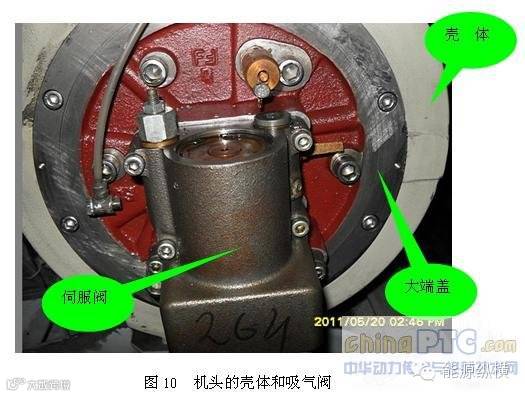 玛泰滑片机是典型的便于维护的结构,见图9、图10所示,机头由壳体(油池)、定子(缸体)、转子、大端盖(吸气阀端)、小端盖(连轴器端)、吸气伺服阀组、油分离器等主要部件组成。大小端盖均由螺栓坚固在缸体上,定子总成由大端盖直接用螺栓固定在壳体上,拆卸时将螺栓卸下就可直接从壳体上抽出。所以检修主机非常方便。